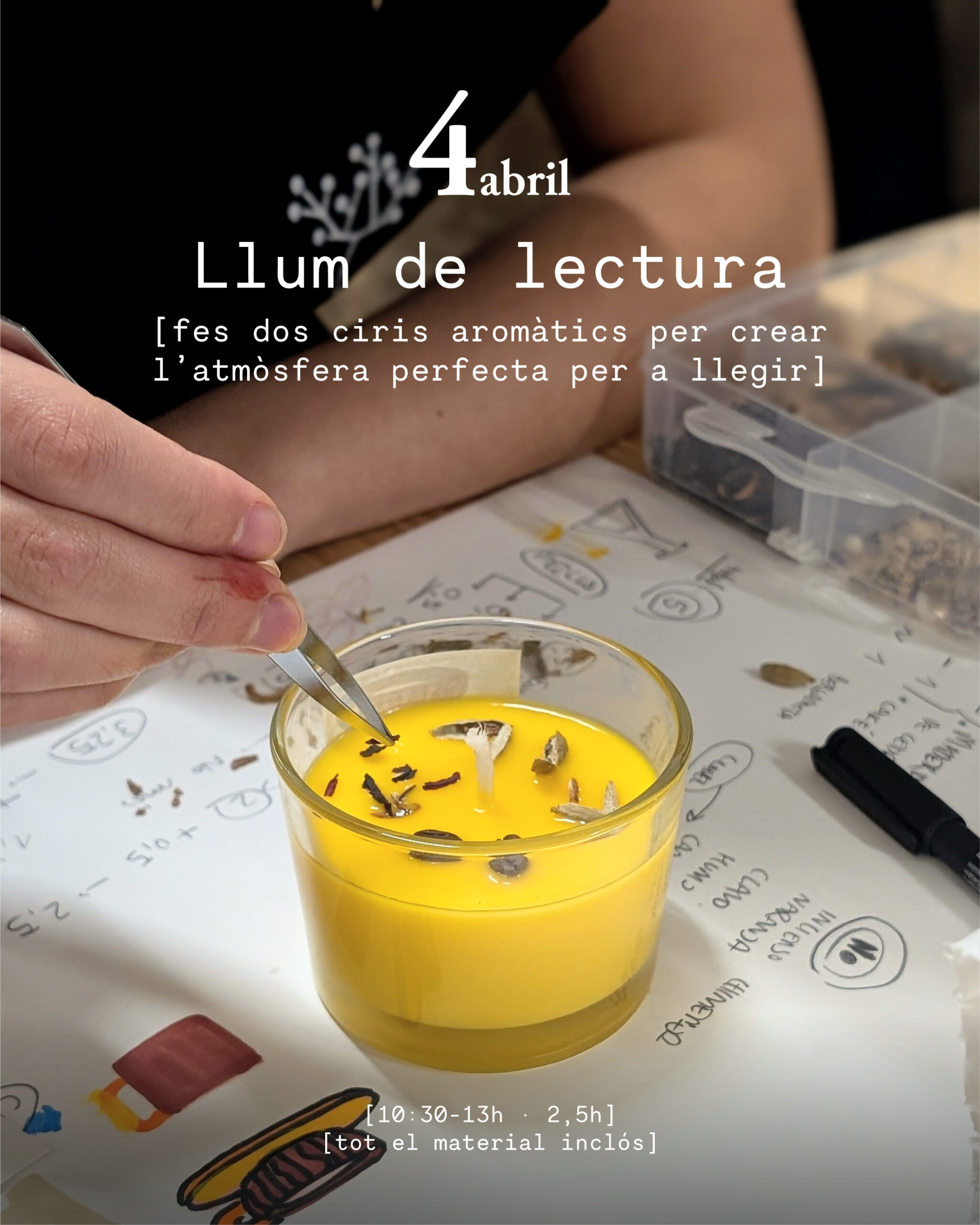 En Llum de lectura nos acercaremos al proceso de creación de velas aromáticas artesanas, trabajando con cera vegetal y esencias cuidadosamente seleccionadas. A lo largo del taller aprenderás a combinar aromas, preparar la […]
