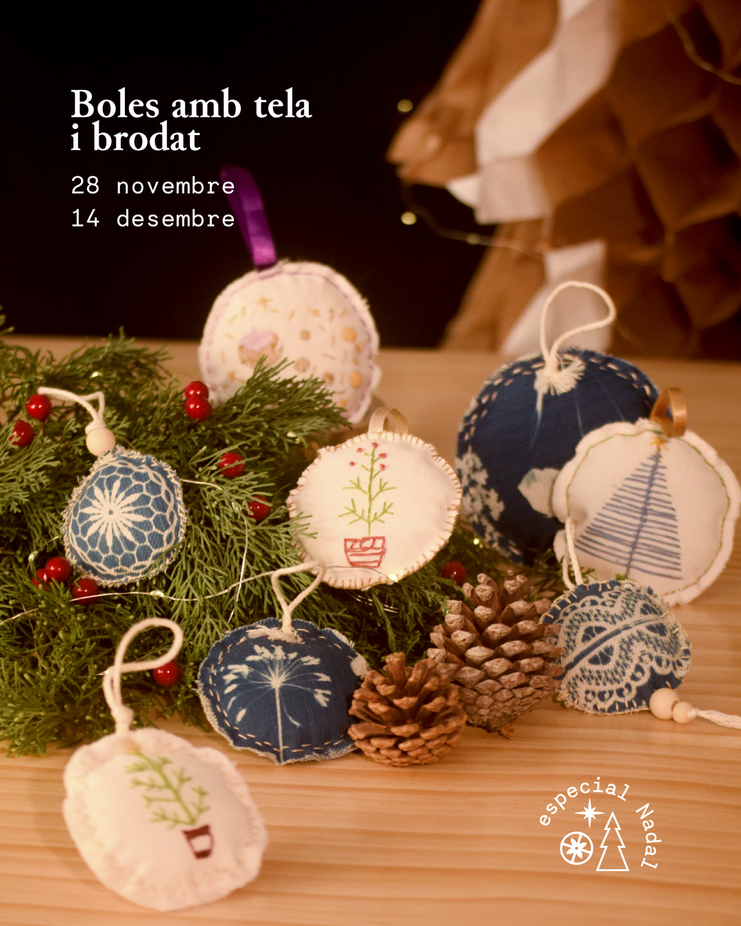 Haz bolas de Navidad para decorar el árbol o la casa. Tenemos telas ya preparadas: algunas con impresiones de cianotipia y otras listas para bordar. En el taller puedes bordar motivos navideños o posicionar las impresiones de cianotipia como protagonistas para convertirlas en bolas de Navidad con carácter y tacto artesanal.